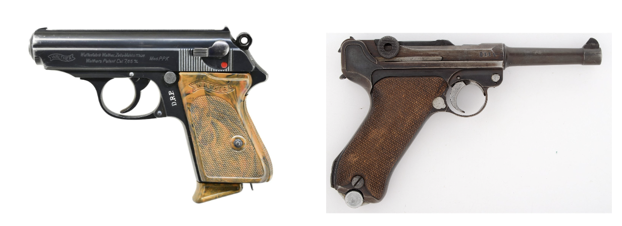 DRP-marked 1936 vintage Walther PPK and German 1918 DWM P.08 Luger Pistol