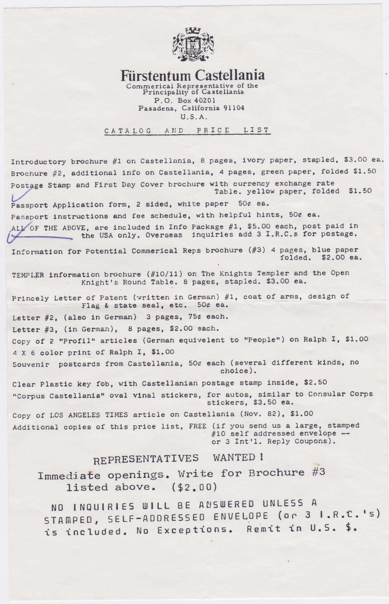 “Created by “Prince Ralph I” and a group of disenchanted Austrians on 17 February 1974, its location, somewhere in the South Pacific, was kept secret. According to one of its leaders, “Castellania is more a state of mind.” (SPJ, Strauss 82)” Source