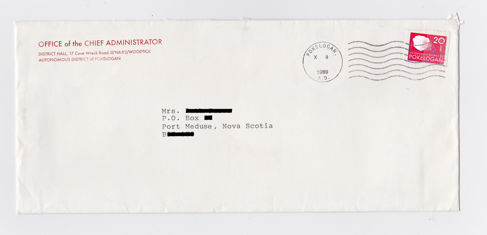 This piece of mail was processed in 1989 by the internal postal system in the District and dropped off at the nearest Canada Post sorting centre which passed it on to the recipient, Anna Miller, in the contemporary village of Port Meduse. The stamp seems to be an updated version of the 1960s collection of Pokelogan stamps (see the following chapter), found in Anna’s possession uncoupled from any envelope but clearly used.