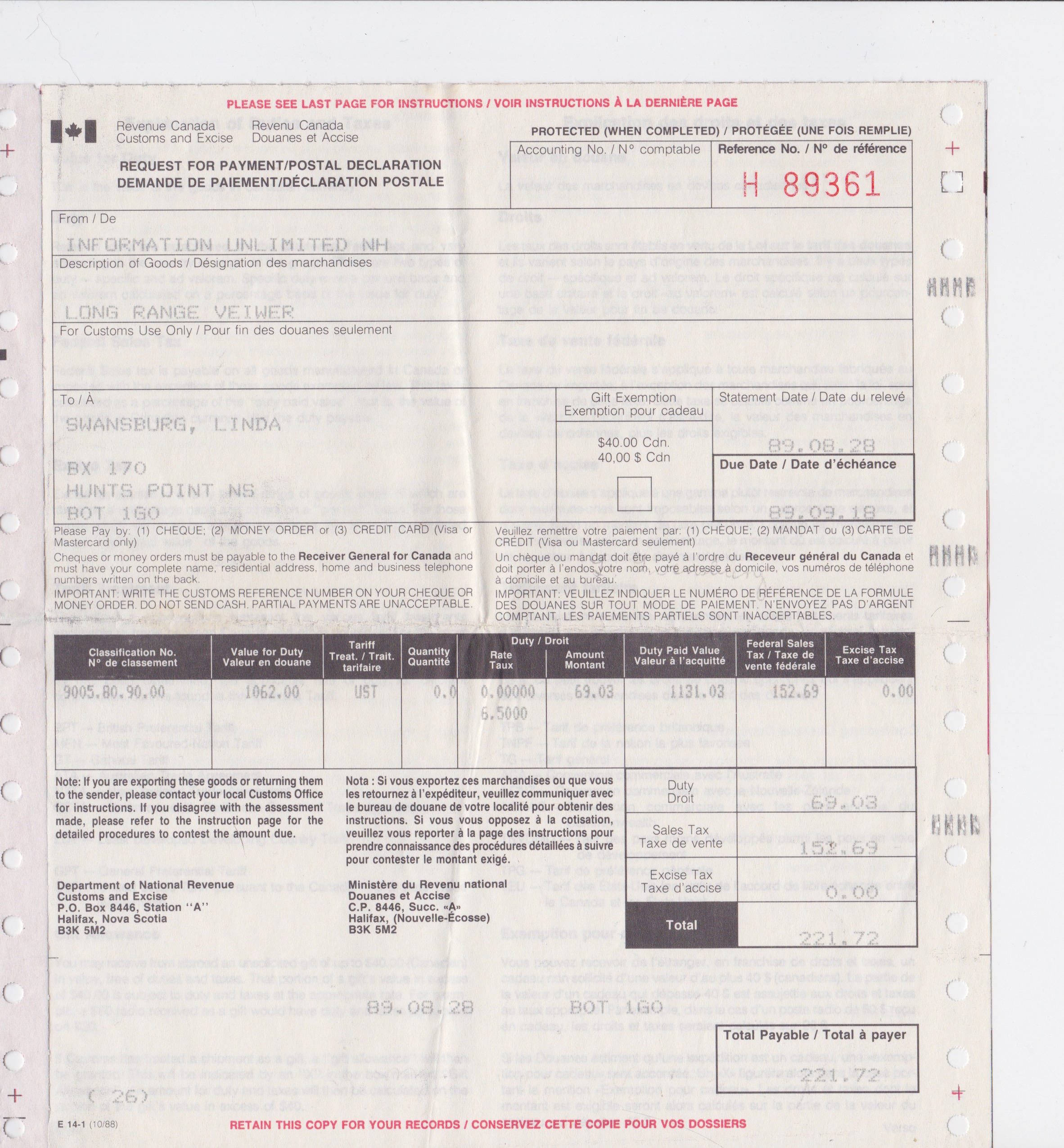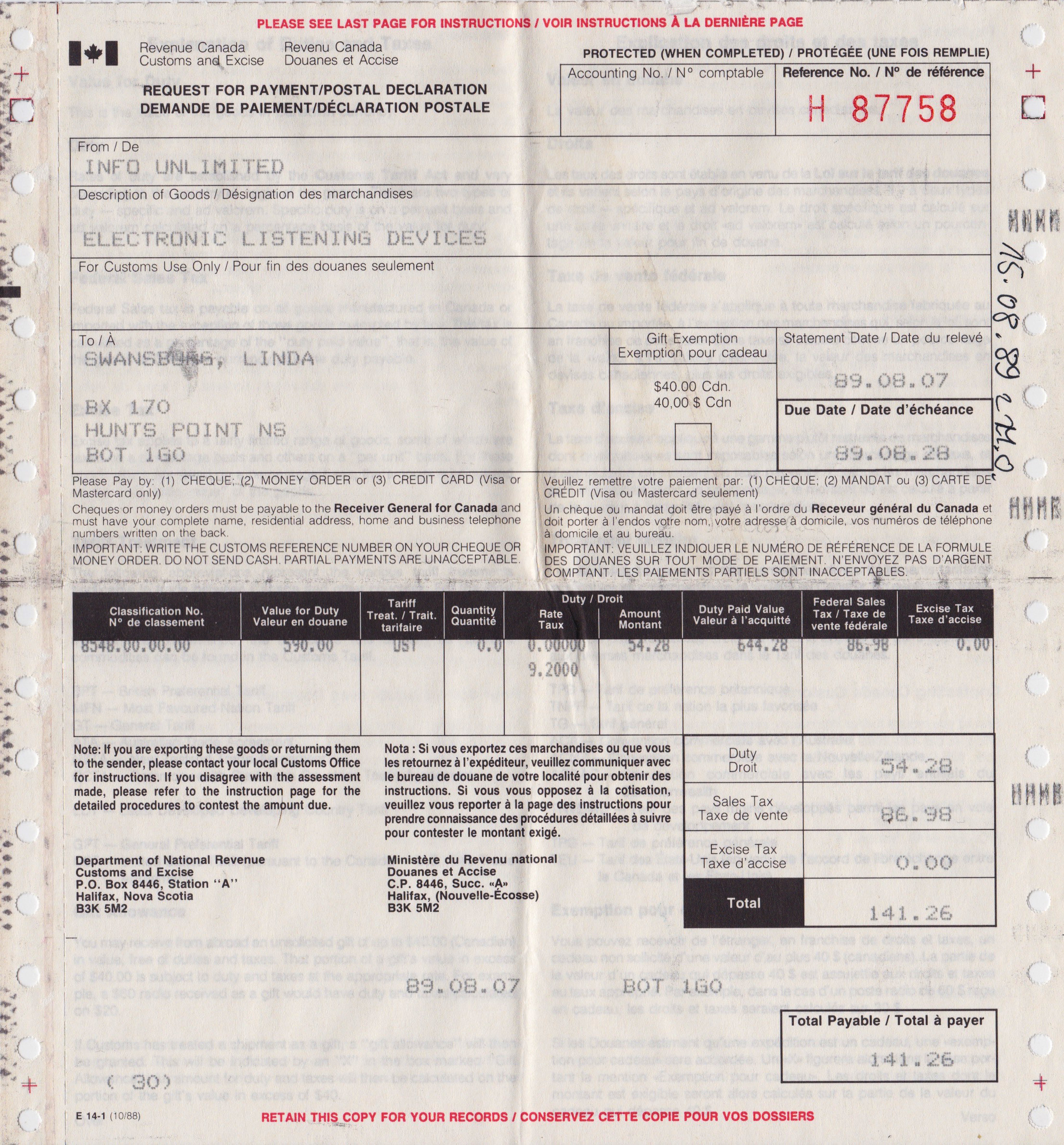 She had catalogues in both German and English for surveillance equipment and spent thousands of dollars on long range viewers and electronic listening devices from a company called Information Unlimited (which actually still existed until the death of its founder in 2023) under the name Linda Swansbourg, collected at a post office box in Hunt’s Point, Nova Scotia.