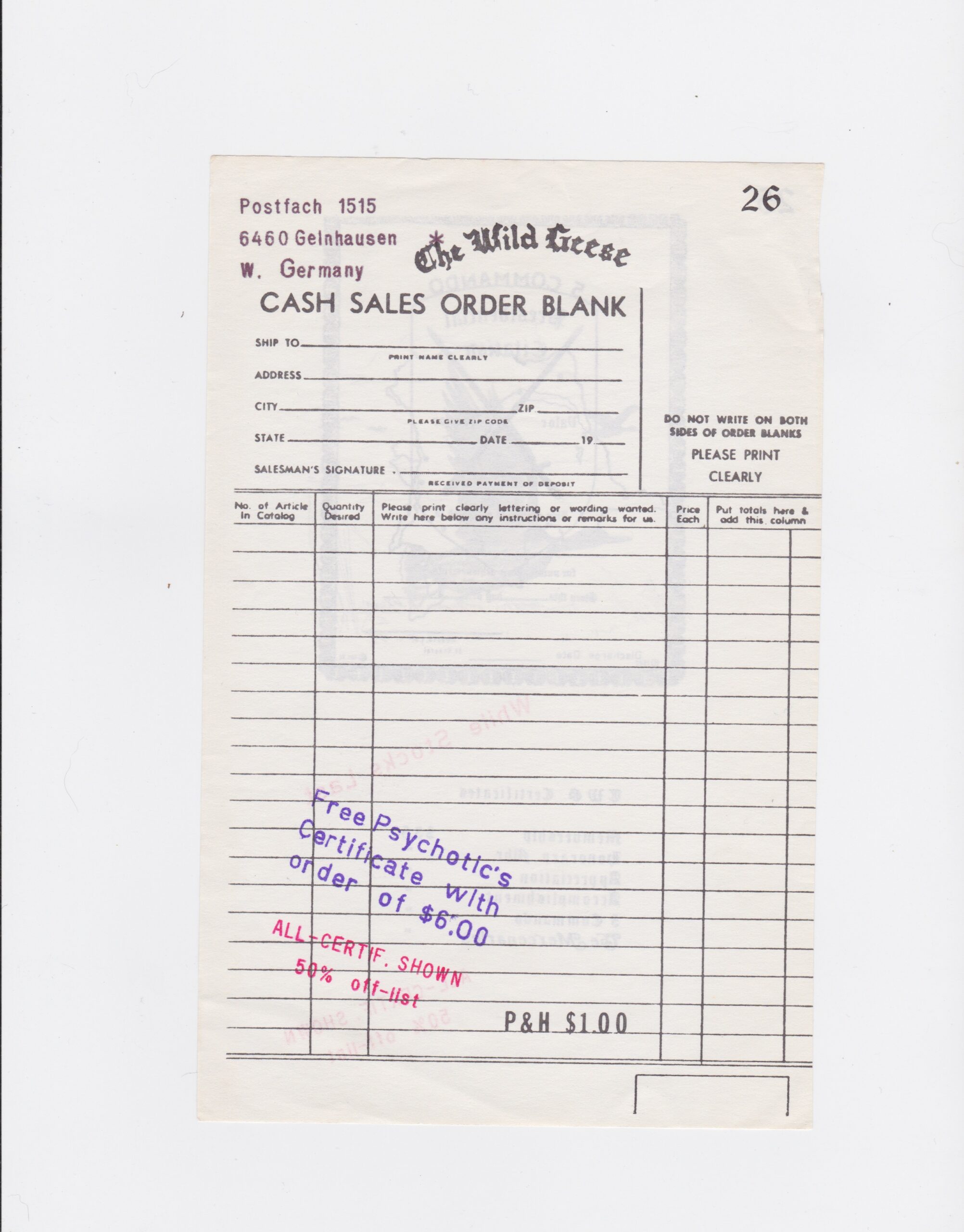 Special offer stamped on the Wild Geese order form: “Free Psychotic’s Certificate with order of $6.00.”